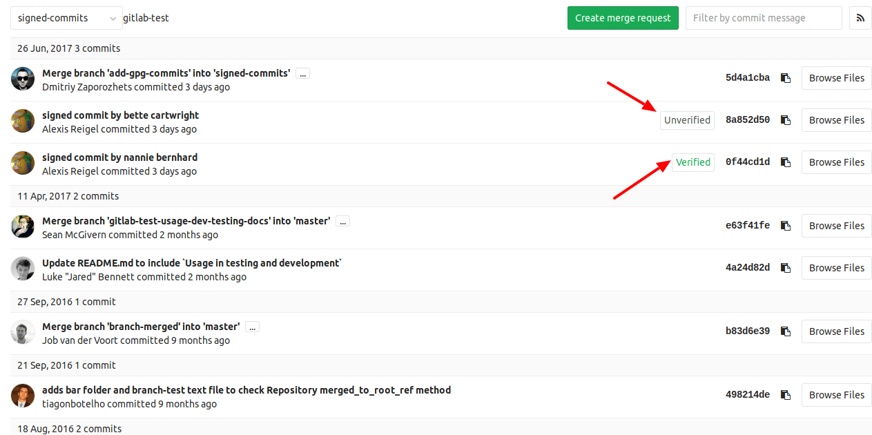 Within a project or merge request, navigate to the Commits tab. Signed commits will show a badge containing either "Verified" or "Unverified", depending on the verification status of the GPG signature.